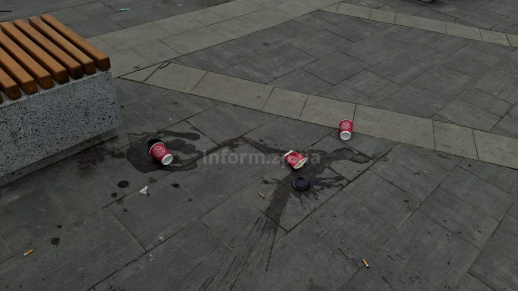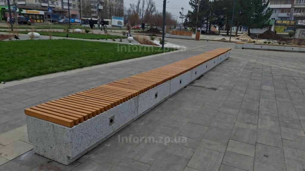 Центральною віссю простору стала довга, майже безперервна лавка з дерев’яних планок на масивній бетонній основі. Поруч — касетні клумби з молодими кущами та травами, висипані щебенем і корою замість звичних квітників. Біля однієї з лавок — розчавлені паперові стаканчики з-під кави й недопалки, хоча секційні урни стоять за кілька кроків.