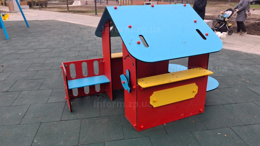 Для найменших облаштували окремі, спокійніші зони: пружинні звірі, невисокі гойдалки, балансири. Поряд — яскрава ігрова «хатинка», що одночасно нагадує кіоск, кухню й театральну сцену.