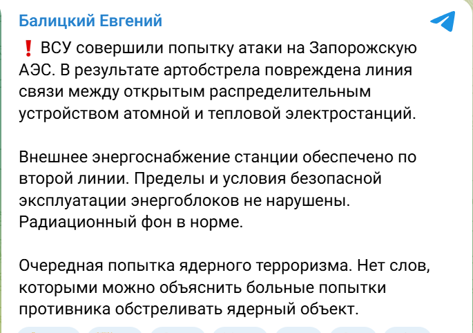 Минулого тижня локальні окупаційні телеграм-канали знову активізували тему атак на ЗАЕС, які нібито здійснюють ЗСУ. Основну інформацію про це транслював телеграм-канал окупаційного губернатора, колаборанта Євгенія Баліцкого, де він знову розганяв тему “ядерного тероризму”.