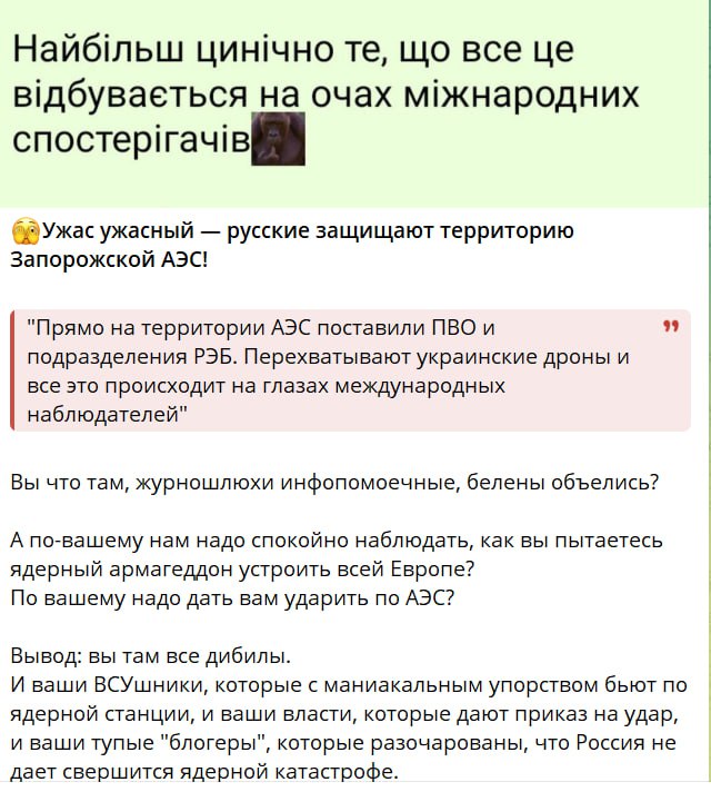 У відповідь на це пропагадисти відповіли в звичайній образливій манері: “Жах жахливий – росіяни захищають територію Запорізької АЕС! А на вашу думку, нам треба спокійно спостерігати, як ви намагаєтеся ядерний армагедон влаштувати всій Європі? На вашу думку, треба дати вам ударити по АЕС? Висновок: ви там усі дібіли. І ваші ВСУшники, які з маніакальною завзятістю б’ють по ядерній станції, і ваша влада, яка дає наказ на удар, і ваші тупі «блогери», які розчаровані, що Росія не дає відбутися ядерній катастрофі”.