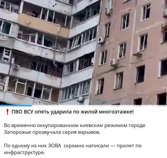 “ППО ЗСУ знову вдарила по житловій багатоповерхівці! У тимчасово окупованому київським режимом місті Запоріжжі пролунала серія вибухів. По одному із них ЗОВА скромно написали — приліт інфраструктурою. Натомість роботу криворукого ППО багатоповерховим будинком розігнали по всіх каналах за 12 хвилин. Чекали на місці?” (На самом дєлє в Запорожьє, 17 грудня);