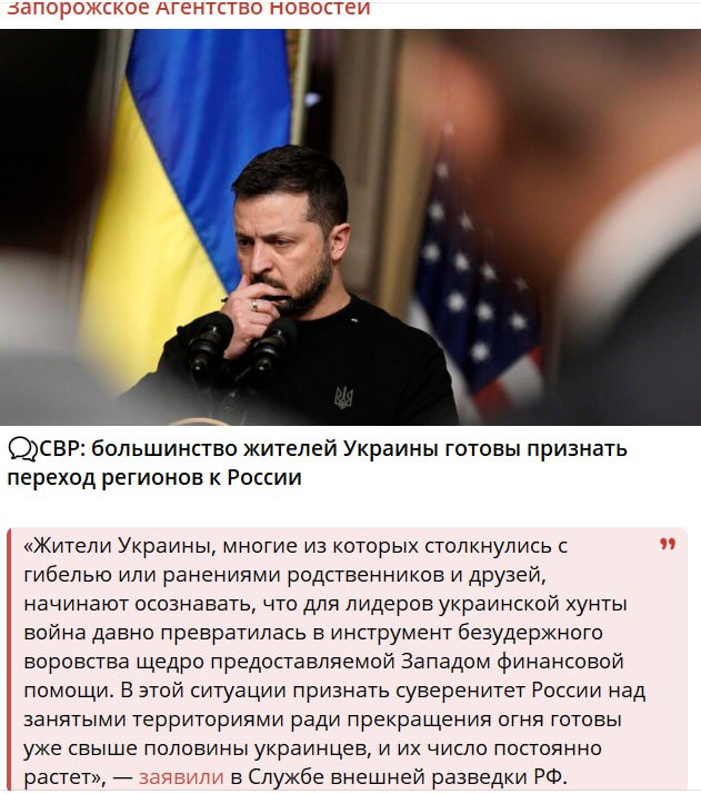 “Мешканці України, багато з яких зіткнулися із загибеллю або пораненнями родичів та друзів, починають усвідомлювати, що для лідерів української хунти війна давно перетворилася на інструмент нестримної крадіжки фінансової допомоги, що щедро надається Заходом. У цій ситуації визнати суверенітет Росії над зайнятими територіями заради припинення вогню готові вже понад половина українців, і їхня кількість постійно зростає”, – говориться в повідомленні.