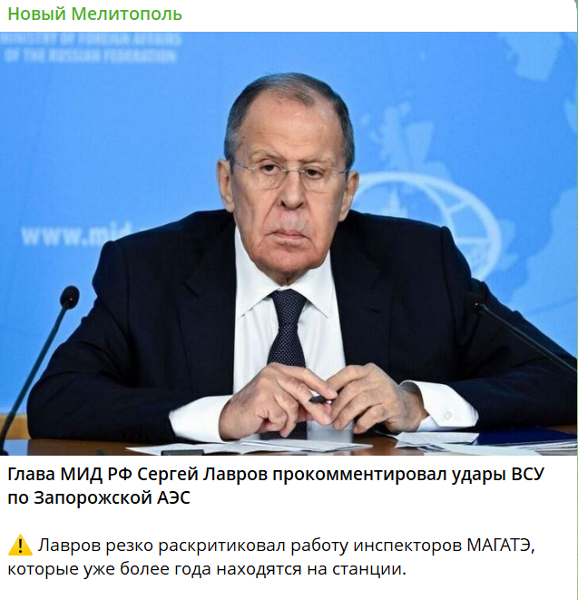 Тему “ядерного тероризму” з новою силою підхопив і міністр МЗС РФ Сергій Лавров. Так, в телеграм-каналі “Новий Мелітополь” 16 грудня з’явився допис з черговою порцією звинувачень від нього вже на адресу МАГАТЕ, бо воно, на відміну від РФ не звинувачує ЗСУ у атаках, бо, насправді, не можу встановити джерело атак.