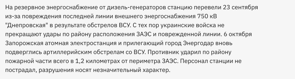 Нагадаємо, що зовнішнє електропостачання є одним із семи стовпів ядерної безпеки, визначених МАГАТЕ. У вересні, за 2 тижні до попереднього знеструмлення, очільник МАГАТЕ Рафаель Гроссі попереджав, що станція працює лише на одній зовнішній лінії електропостачання, всі реактори у стані холодної зупинки, а рівень води у басейні охолодження наближається до критичного.