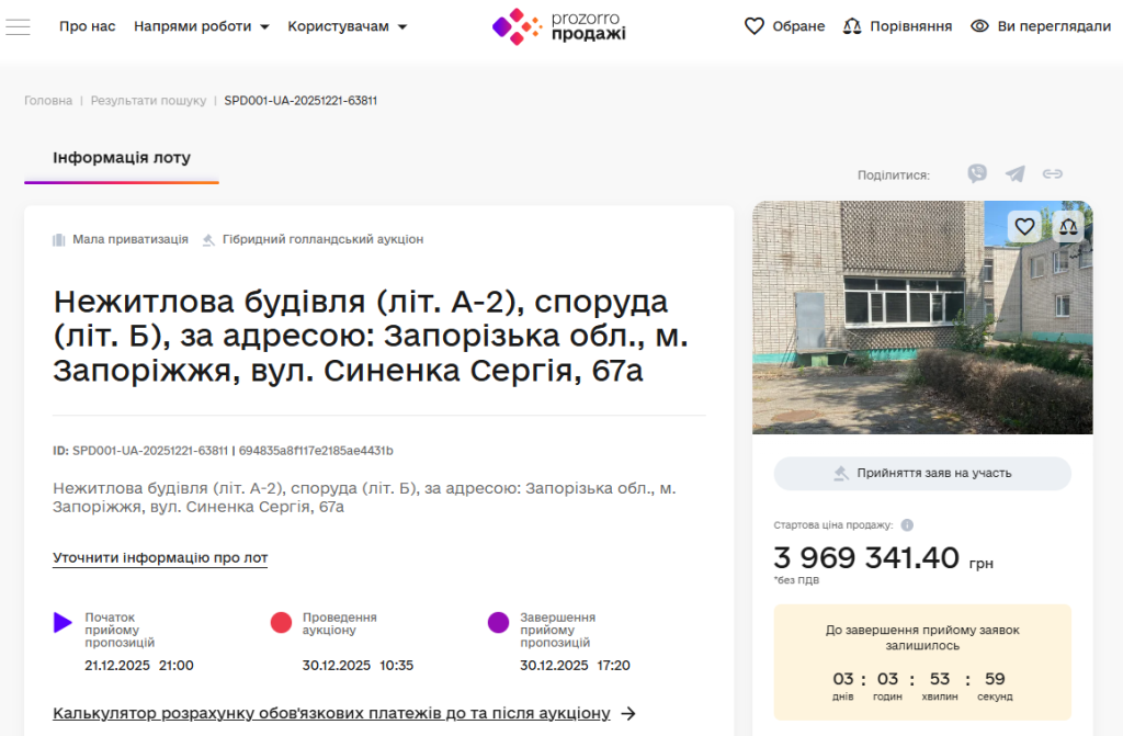 Аукціон оголосило регіональне відділення Фонд державного майна України у Запорізькій області. Продаватимуть нежитлову будівлю площею 1340,4 м² та двоповерхову споруду з підвалом за адресою вулиця Сергія Синенка, 67а. Торги заплановані на 30 грудня 2025 року.