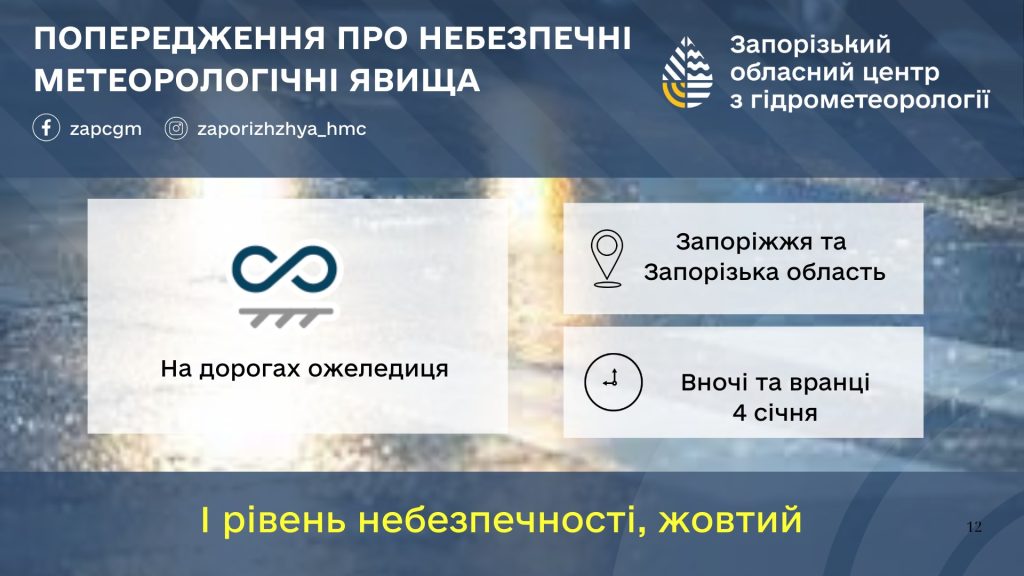 Синоптики попереджають про небезпечні погодні умови в Запоріжжі та Запорізькій області. У ніч на 4 січня та вранці на автошляхах очікується ожеледиця.