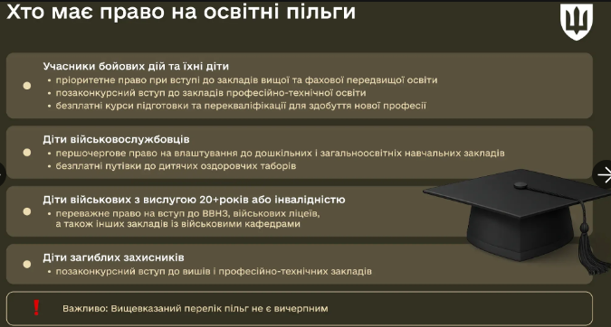 Особливі переваги мають діти, батьки яких відслужили 20 і більше років, звільнені за станом здоров’я, віком або у зв’язку зі скороченням штатів, або ті, хто отримав інвалідність через службу. Такі діти можуть вступати до військових ліцеїв, ліцеїв із посиленою військово-фізичною підготовкою, вищих військових навчальних закладів і закладів фахової передвищої освіти протягом трьох років після завершення середньої освіти.