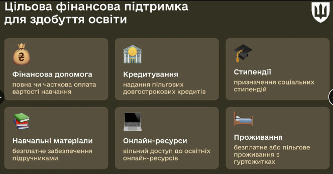 Крім того, держава забезпечує для дітей військовослужбовців та ветеранів бойових дій цільову підтримку для здобуття професійної та вищої освіти: повну або часткову оплату навчання, пільгові кредити, соціальні стипендії, безоплатні підручники, проживання у гуртожитках, доступ до Інтернету та систем баз даних у навчальних закладах.
