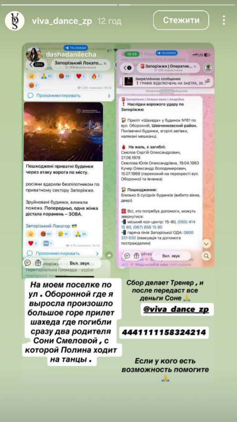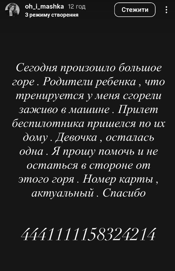 Внаслідок обстрілів 20 січня загинула сімейна пара. Дівчинка Софія залишилась без батьків. Тренерка, до якої дівчинка ходить на заняття, відкрила збір, щоб допомогти родині.