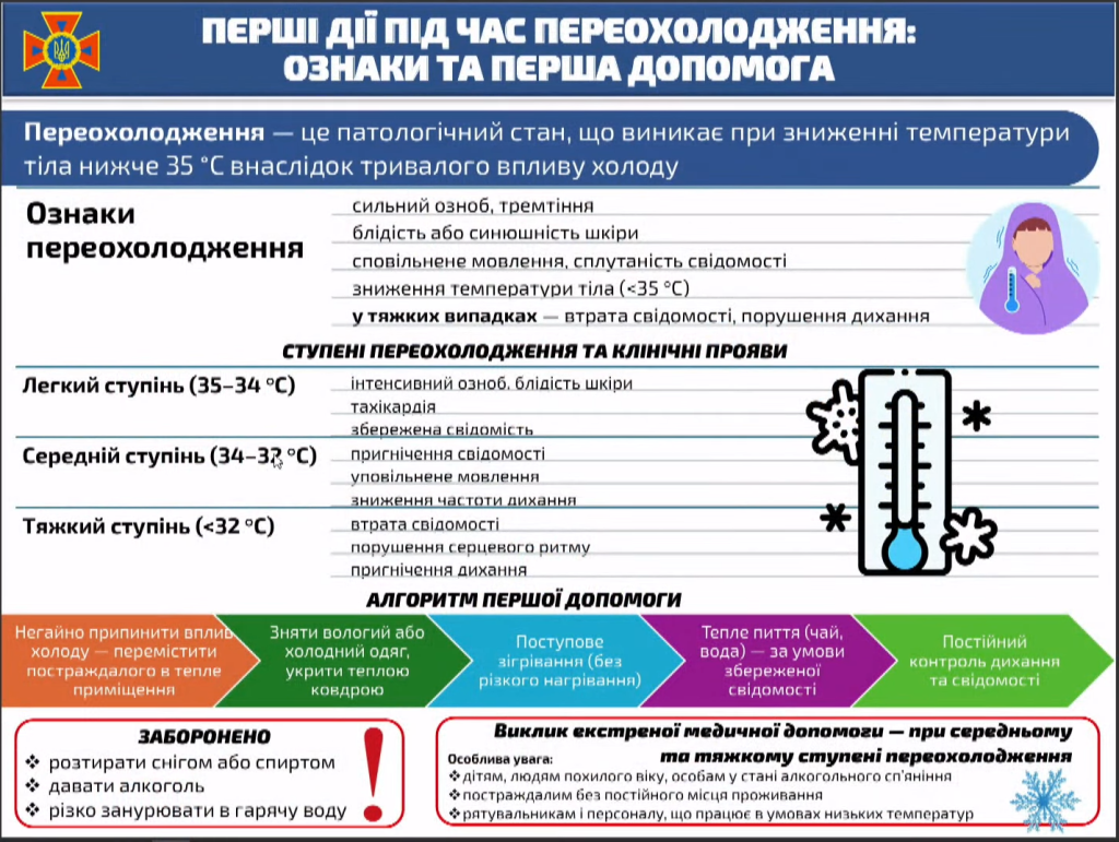 Далі варто одразу викликати екстрену медичну допомогу й дотримуватися вказівок диспетчера. За можливості перемістити постраждалого в тепле приміщення, зняти холодний або вологий одяг, накрити термопокривалом чи ковдрою. Якщо людина при тямі, дати тепле безалкогольне пиття та забезпечити постійний нагляд до приїзду медиків.