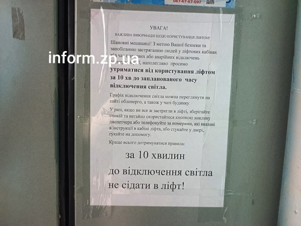 Крім того, у деяких під’їздах в Запоріжжі можна побачити попередження щодо користування ліфтом під час дії графіків. Зокрема, радять за 10 хвилин до відключення світла не сідати в ліфт.