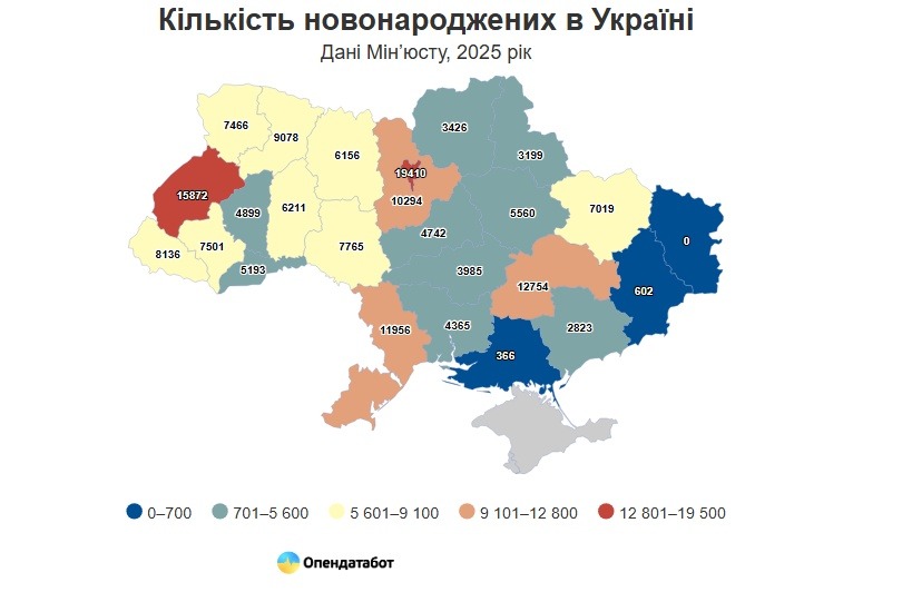 Загальна цифра новонароджених за 2025 рік в Україні — близько 169 тисяч дітей. Водночас зафіксовані понад 485 тисяч смертей. За рік народжуваність в Україні скоротилась на чотири з половиною відсотки, а смертність — на два відсотка.