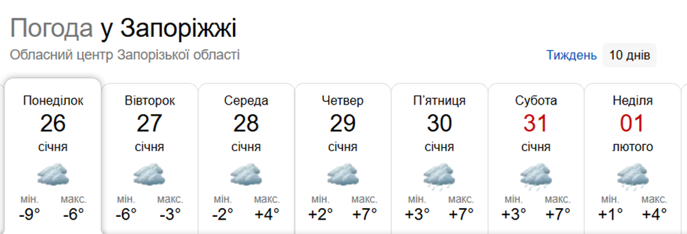 26 січня небо Запоріжжя буде хмарним до самого вечора. Вночі очікується дрібний сніг.