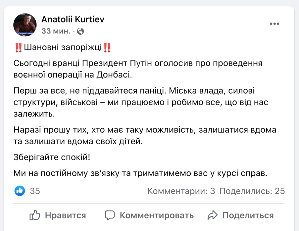 У Запоріжжі в цей час відбувалося засідання міського штабу з військовими та силовиками. Виконувач обов’язків міського голови Анатолій Куртєв закликав мешканців не панікувати та залишатися вдома.