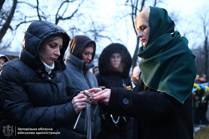 Тут зібралися родини полеглих українських оборонців. До меморіалу прийшли також голова Нацбанку України Андрій Пишний, очільник Запорізької ОВА Іван Федоров, його заступник Михайло Семікін, представники силових структур, ветеранської спільноти та родини загиблих.