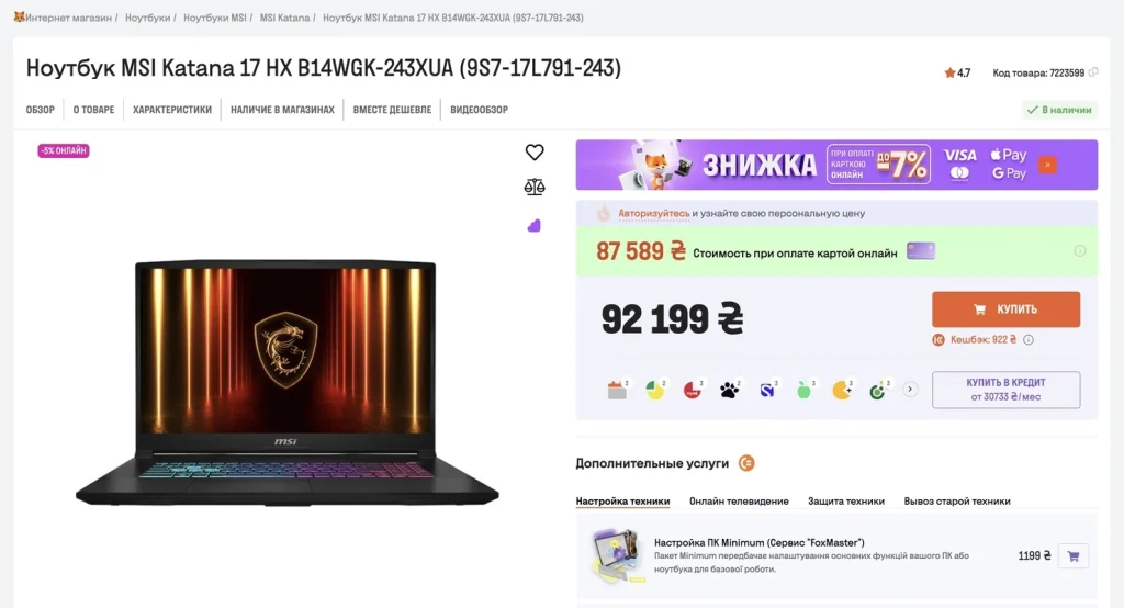 Вибираючи Фокстрот, покупець отримує не просто техніку, а комплексний сервіс: зручний сайт, зрозумілі умови покупки, чесні ціни і підтримку на всіх етапах. Якщо вам потрібен сучасний ігровий ноутбук із запасом продуктивності на кілька років вперед, MSI Katana 17 HX — один із найкращих варіантів у своєму класі. А придбати його швидко і безпечно можна саме в Фокстрот.