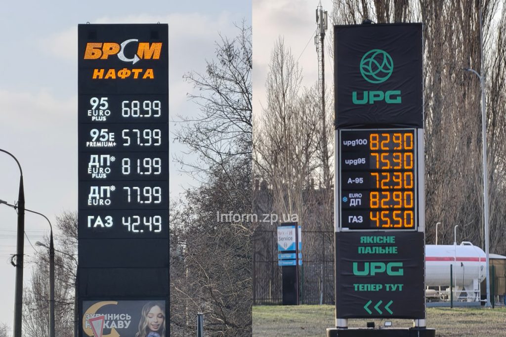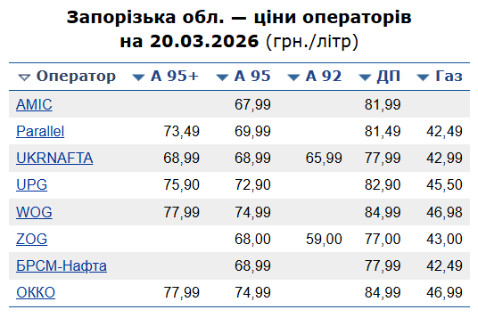 Як повідомляє Мінфін, у Запорізькій області станом на 20 березня середні ціни такі: бензин А-95+ – 74,87 грн за літр, А-95 – 70,86 грн, дизель – 81,17 грн, автогаз – 44,35 грн.