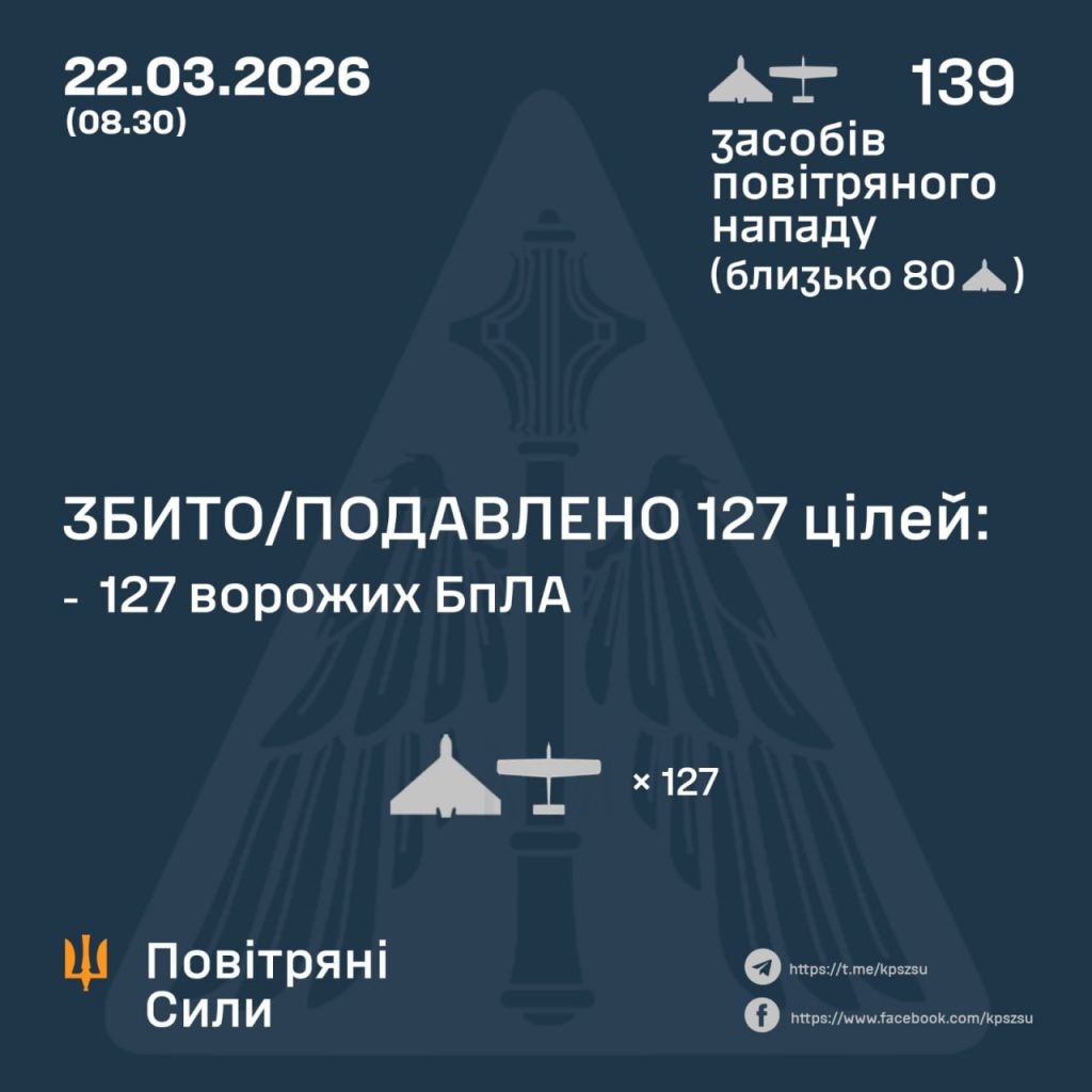 У ніч на 22 березня російські війська атакували Україну 139 ударними безпілотниками, зокрема типу «Shahed», а також дронами «Гербера», «Італмас» та іншими, зокрема і по Запорізькій області.