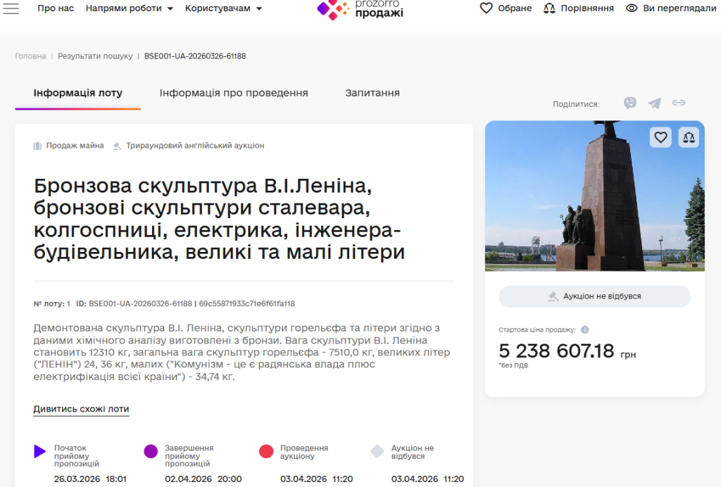 Йдеться про бронзову скульптуру Леніна, а також фігури зі стели – сталевара, колгоспниці, будівельника та вченого, і літери з постаменту. Загальна вага лоту становить майже 20 тонн.