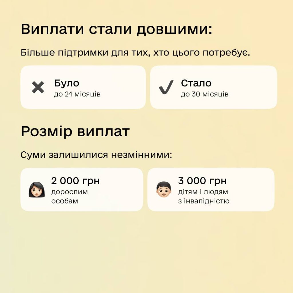 Виплати для найбільш вразливих категорій ВПО продовжили. Тепер їх надаватимуть до 30 місяців замість 24. Допомогу для дітей призначатимуть незалежно від доходу батьків.
