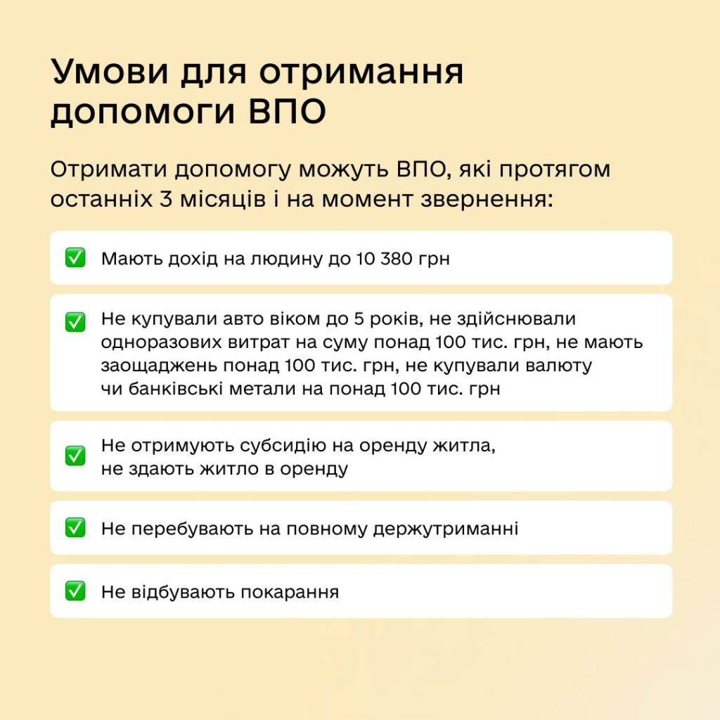 Також переселенці, яким раніше припинили виплати через високий дохід, можуть повторно подати заяву на перегляд. У 2026 році граничний дохід для отримання допомоги становить 10 380 грн на одну людину.