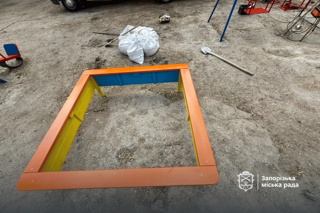 В Олександрівському районі Запоріжжя триває відновлення дитячого майданчика, який зазнав пошкоджень внаслідок російської атаки 26 лютого. Тоді вибух дрона-камікадзе стався неподалік і суттєво пошкодив елементи ігрової зони.